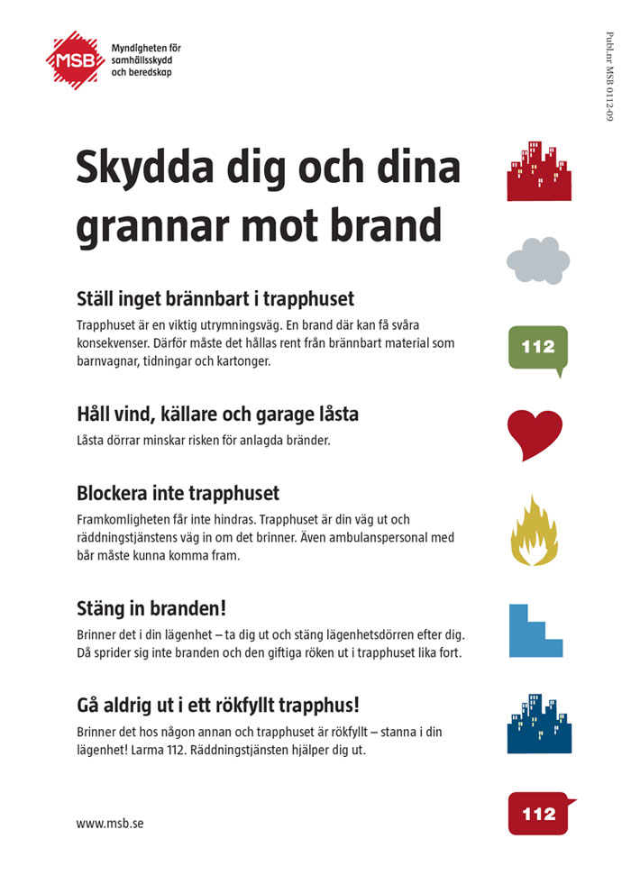 Var noga med att inte lämna dörrar ut ur fastigheten olåsta och släpp inte in okända personer. Tänk på att avregistrera din tag till huset eller din fjärrkontroll till garaget om du blir av med den. Det görs hos Stadsbostäder. Din lägenhet ska vara utrustad med brandvarnare och var försiktig med eld.